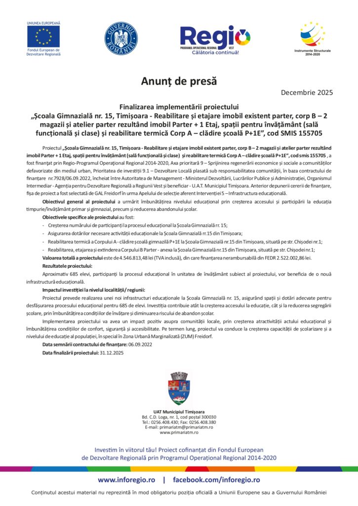 Finalizarea implementării proiectului „Școala Gimnazială nr. 15, Timișoara – Reabilitare și etajare imobil existent parter, corp B – 2 magazii și atelier parter rezultând imobil Parter + 1 Etaj, spații pentru învățământ (sală funcțională și clase) și reabilitare termică Corp A – clădire școală P+1E”, cod SMIS 155705