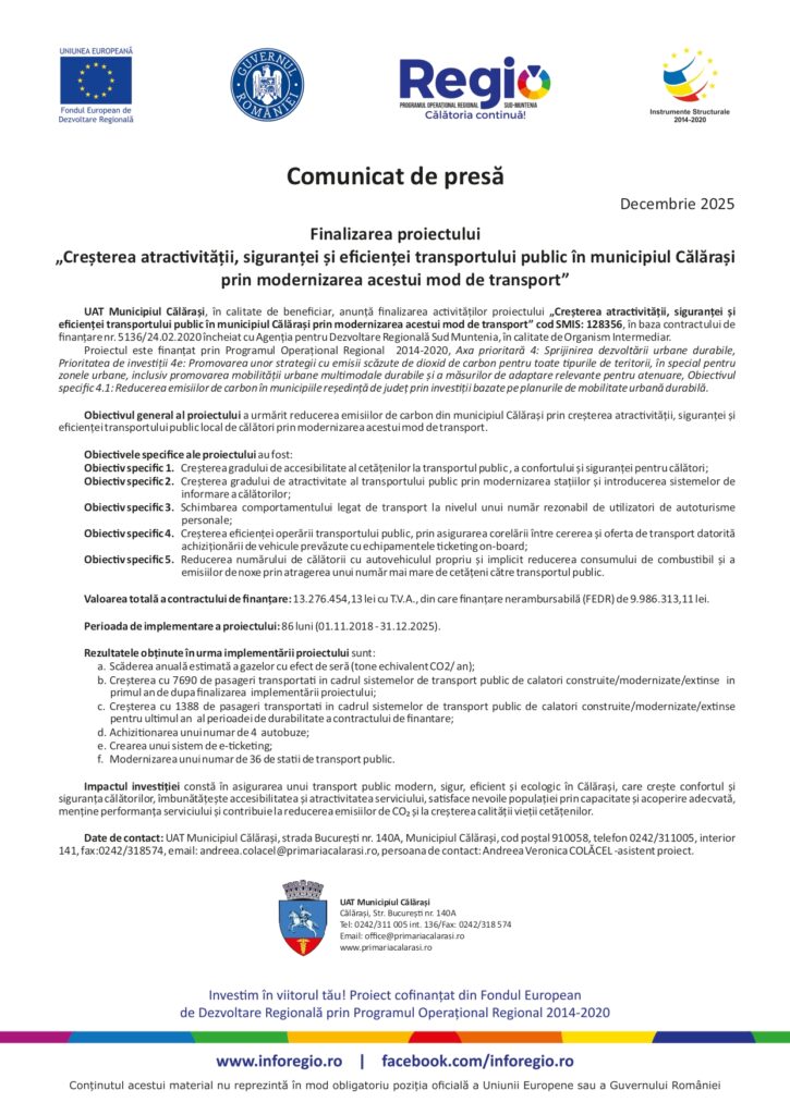 STIRI Finalizarea proiectului „Creșterea atracvității, siguranței și eficienței transportului public în municipiul Călărași prin modernizarea acestui mod de transport” adminDecember 12, 2025