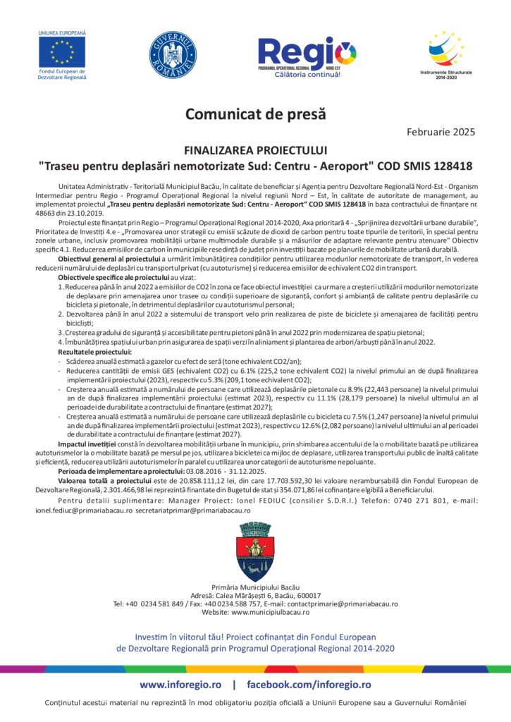 FINALIZAREA PROIECTULUI „Traseu pentru deplasări nemotorizate Sud: Centru – Aeroport”