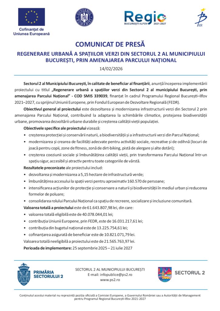 STIRI Regenerare urbană a spațiilor verzi din Sectorul 2 al municipiului Bucureș, prin amenajarea Parcului și Insulei Plumbuita adminFebruary 14, 2026